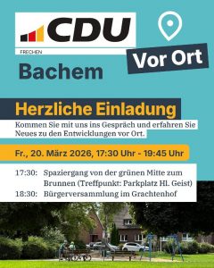 Die CDU Frechen lädt alle Bürgerinnen und Bürger herzlich zu einem Bürgerdialog nach Bachem ein. Am Freitag, den 20. März 2026, haben Interessierte die Gelegenheit, sich über aktuelle Entwicklungen im Ort zu informieren, eigene Ideen einzubringen und mit Vertreterinnen und Vertretern der CDU ins Gespräch zu kommen. Der Termin beginnt um 17:30 Uhr mit einem …